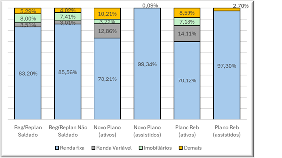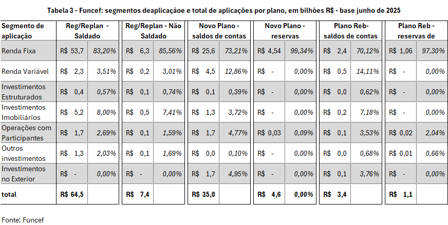 Em todos os planos Funcef, aplicações concentradas em Renda Fixa. Nesse segmento no Novo Plano, saldos de contas de ativos, 73,21% e no Plano Reb, 70,12%. Nas reservas de assistidos, quase  a totalidade dos recursos: no Novo Plano, 99,34%; no Plano Reb, 97,30%. Ainda em Renda Fixa, no Saldado, 83,20%, e no Não Saldado, 85,56%.
