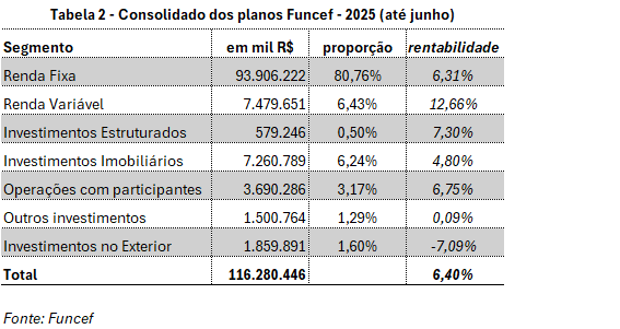 No consolidado dos planos Funcef, base junho, rentabilidade acima da meta para aplicações em Renda Fixa, segmento composto predominantemente por títulos da dívida pública da União, em Renda Variável, onde se contabilizam, entre outros investimento, ações negociadas em bolsa de valores, em Investimentos Estruturados (FIP) e em Operações com Participantes (empréstimos). Investimentos Imobiliários totalizaram resultado abaixo da meta e Investimentos no Exterior variaram negativamente.
