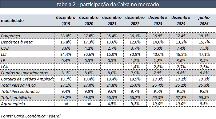 A participação da Caixa no mercado em junho de 2025, na comparação a dezembro de 2024, revela crescimento em poupança, depósitos à vista e, de forma residual, na carteira de crédito. Houve pequena redução na fatia de mercado nos segmentos imobiliário e agronegócio.