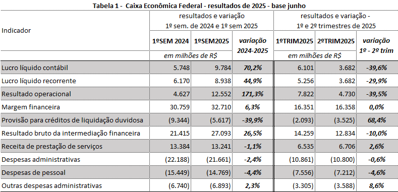 A Caixa alcançou no primeiro semestre de 2025 lucro líquido contábil de R$ 9,784 bilhões, montante 70,2% superior ao do mesmo período de 2024, R$ 5,748bilhões. O lucro líquido recorrente, no qual se desconsideram valores extraordinários do período, foi de R$ 8,938 bilhões, crescimento de 44,9% em relação aos R$ 6,170 bilhões contabilizados no primeiro semestre de 2024. Peso significativo para o resultado semestral observa-se na redução de R$ 3,727 bilhões na rubrica provisão para crédito de liquidação duvidosa. Houve crescimento do resultado da intermediação financeira, 26,5%. Redução na arrecadação com tarifas e receitas de prestação de serviços, bem como em despesas de pessoal.