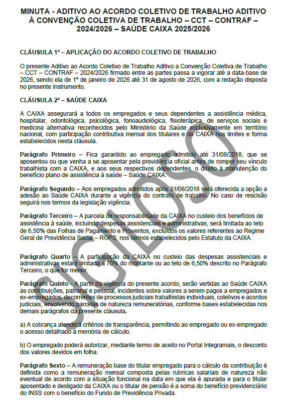 A minuta foi disponibilizada muito tempo depois da votação iniciada, mas, digno de registro,  um avanço em relação ao conteúdo do Acordo Saúde Caixa 2023-2025, agora a ser substituído, que passados dois anos nem ao menos foi publicado pela Contraf-CUT e Fenae.