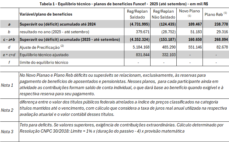 Os planos Funcef alcançaram resultado positivo, exceção ao Reg/Replan Não Saldado, no acumulado de janeiro a setembro de 2025. O déficit no Reg/Replan Saldado, até dezembro de 2024 em R$ 4,731 bilhões, registrou redução de R$ 379,6. milhões e, em setembro, foi contabilizado em R$ 4,352 bilhões. No Não Saldado, déficit acumulado de R$ 153,1 milhões, R$ 28,7 milhões mais que o valor de dezembro de 2024. Novo Plano e Plano Reb, reservas para pagamento de benefícios dos já aposentados ou pensionistas, registraram superavit.