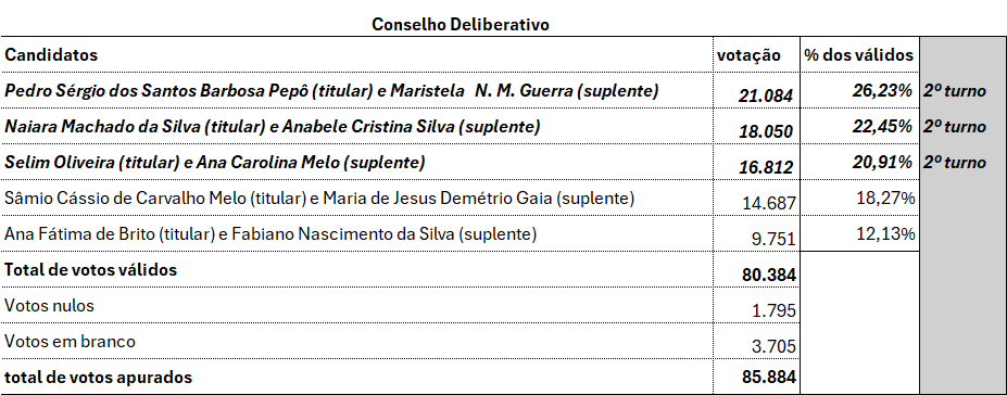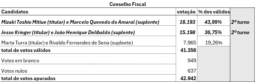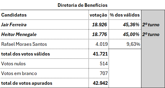 Para o cargo de diretor de benefícios, estão credenciados para o segundo turno Jair Ferreira e Heitor Menegale, com, respectivamente, 45,36% e 45% dos votos válidos