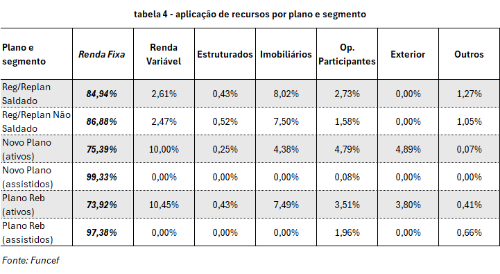 Seguindo tendência de 2024, cresceu em 2025 a aplicação dos planos Funcef em Renda Fixa, predominantemente títulos públicos federais (destaque em negrito na tabela 4). Em Renda Variável, segmento mais rentável em 2025, aplicação apenas residual no Saldado e Não Saldado.