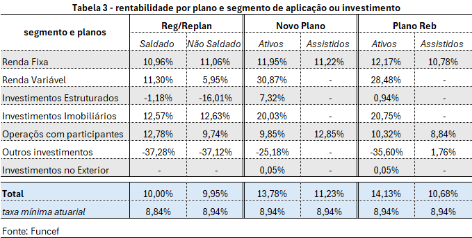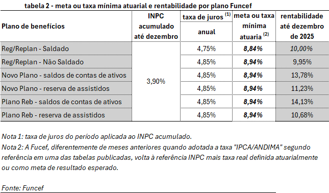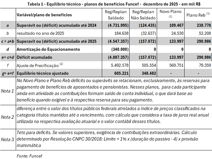 A Funcef registrou resultados acima das metas por ela estabelecidas para todos seus planos em 2025. No entanto, Reg/Replan Saldado, com rentabilidade de R$ 184,6 milhões, encerrou o exercício com déficit de R$ 4,887 bilhões. No Reg/Replan Não Saldado, resultado negativo R$ 32,6 milhões e déficit acumulado de R$ 157 milhões (tabela 1, linhas “b” e “c”). Novo Plano e Plano Reb, reservas para pagamento de benefícios de assistidos, apresentaram superávit.
